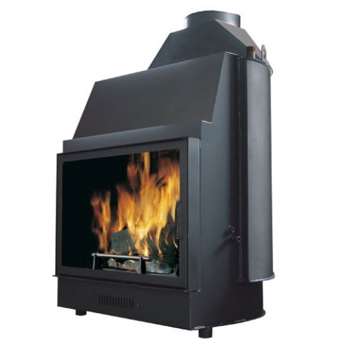Каминная топка для открытой или закрытой системы. Корпус из утолщенной стали, чугунный очаг, витрокерамическое стекло, резистентное к температуре до 800°, бак для воды на 60 литров.