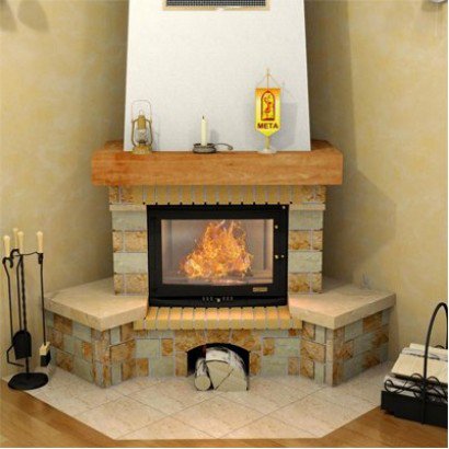 Предтопочная и надтопочная часть выложена шамотом песочно-жёлтого цвета. Каминная балка изготовленная из МДФ и покрытая шпоном дуба, послужит отличной полкой для каминных аксессуаров, таких как часы, канделябры, рамки с фотографиями и др. В нижней части облицовки расположена удобная ниша для хранения и сушки дров.