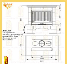 Основа камина выполнена из камня META Stone™ (серо-белого цвета), декоративные вставки сделаны из полированного мрамора «ИМПЕРАДОР» оттенков коричневого цвета, предтопочная часть выложена из шамота песочно-жёлтого цвета.