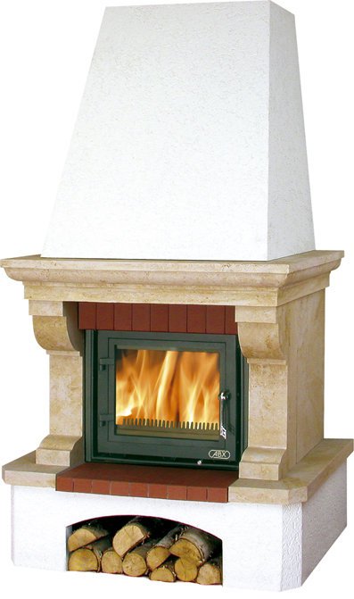 Камин на картинке – пристенная модель чешской каминной компании АВХ, состоящая из топочной камеры и облицовки из натурального песчаника. Топка этого камина из песчаника немного приподнята, организуя в цоколе пространство для открытой дровницы, где можно хранить суточный запас каминного топлива. Пред – и надтопочная часть фронтона облицована шамотным кирпичем, а плоское широкоформатное окно изготовлено из стеклокерамического материала, выдерживающего температурные нагрузки в 700 градусов Цельсия. Благодаря встроенной системе двойного дожига, позволяющей дровам сгорать практически без остатка, камин Glasgow Klasik имеет высокую тепловую эффективность, а развиваемая им мощность в 12 кВт позволяет без труда отапливать до 200 куб. метров жилого пространства.